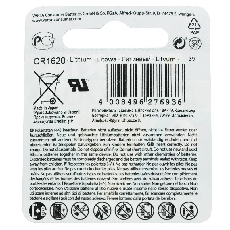 Varta CR1620, Lithium-Knopfzelle, 3 V, Einweg-Batterie, lange Lagerfähigkeit, stabile Spannung, kompatibel