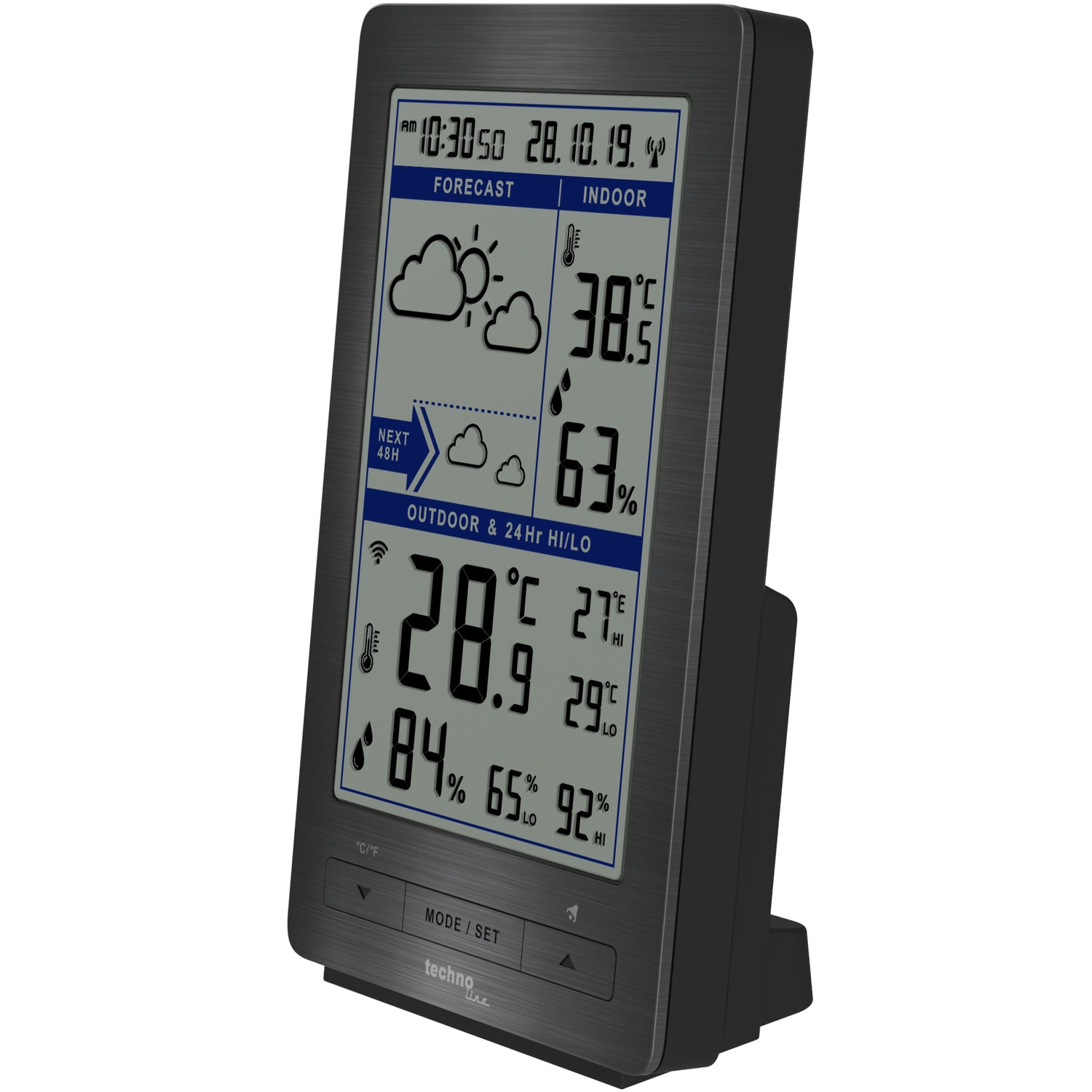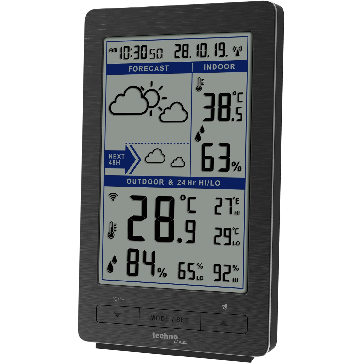 Das große, übersichtliche Display zeigt neben Uhrzeit und Datum auch Innen- und Außentemperatur sowie die Luftfeuchtigkeit an. Mit der Temperaturalarmfunktion können Sie individuelle Grenzwerte festlegen – so werden Sie automatisch gewarnt, wenn es zu heiß oder zu kalt wird. Die MIN/MAX-Anzeige dokumentiert die höchsten und niedrigsten Werte, um Temperaturverläufe nachvollziehen zu können.