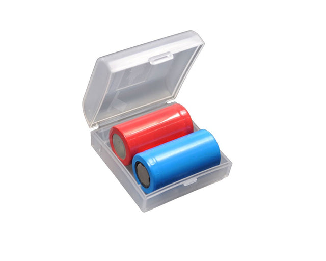 Eine transparente Plastikbox zur sicheren Aufbewahrung von 2x 18350 Akkus.